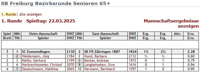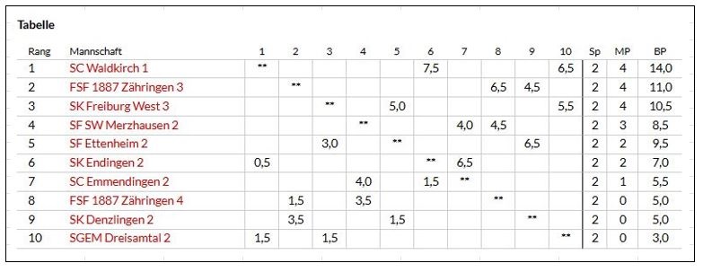 vor Emmendingen (Hund-Weidemann 0,5; Kiefer-Becker 0:1; Herbrechtsmeier-Langheineken 0:1; Hermann-Deutschmann 0:1).